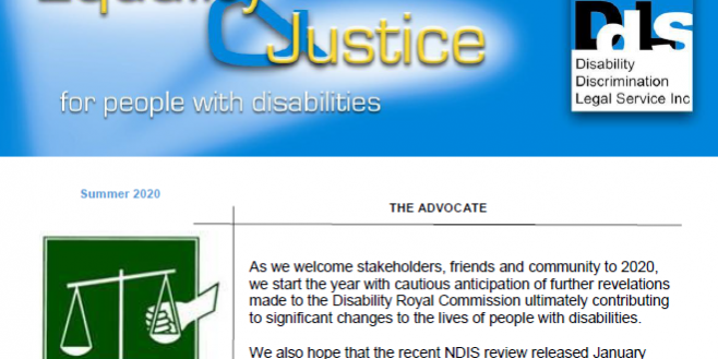 Mar62020NewsThe AdvocateView the Advocate Summer PDF (2020) March 6, 2020 Share this post Share on FacebookShare on Facebook TweetShare on Twitter Share on LinkedInShare on LinkedIn Post navigationPreviousPrevious post:Do you need help to talk to the Disability Royal Commission?NextNext post:A MESSAGE FROM VILLAMANTA RE COVID – 19Related PostsRespect in the workplace trainingMarch 18, 2024Disability Royal Commission report handed downOctober 6, 2023Statement of Support for the Uluru Statement from the HeartJune 30, 2023Single occupant SDA decision at AATFebruary 13, 2022CYHY to be funded for his assistance dogDecember 22, 2021Vaccination CertificateDecember 17, 2021